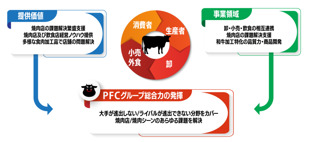 PFCと取り引きを行うことで、生産者からお預かりしたおいしいお肉を鮮度を保ち必要なときに必要な分だけ適正な価格で安定的に提供し、焼肉店専売卸売として長年培った提案力により焼肉店の運営を積極的に支援しながら、お客様の焼肉店を繁盛させることで他の卸売業者との差別化を図っています。